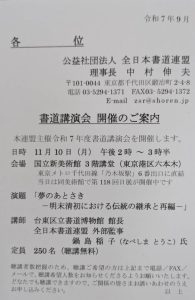 Home 会員, 新着, 未分類 会員のみなさまへ(書全日本書道連盟主催書道講演会) 会員のみなさまへ(書全日本書道連盟主催書道講演会) 2025.10.2 会員、新着、未分類 全日本書道連盟主催 「令和7年度書道講演会」を下記のとおり開催いたします。 お申込は千歳会事務局でも承りますが、全日本書道連盟事務局に直接お申込くださっても結構です。 千歳会会員のかたはお申込の時に「千歳会」と申し添えて下さい。 申込先 連盟事務局 電話 03-5294-1371(月~金 10:0~18:00) FAX 03-5294-1372(24時間受信) E-mail zsr@shoren.jp