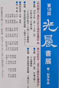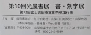 Home 新着, 日本刻字協会関係 第10光晨書展 第10光晨書展 2025.10.5 新着、日本刻字協会関係 第10光晨書展 会期:2025年10月3日(金)~5日(日) 時間:9:00〜18:00(初日は16:00~17:00) 場所:富士吉田市民会館 3階ギャラリー
