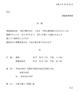 Home 会員, 日本刻字協会関係 会員のみなさまへ(訃報) 会員のみなさまへ(訃報) 2025.10.23 会員、日本刻字協会関係 大和久齋月先生の訃報が入りました。 心よりご冥福をお祈りいたします。 千歳会事務局