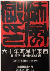 Home 新着, 未分類 馬燕平ー書・畫・篆刻展 馬燕平ー書・畫・篆刻展 2025.10.30 新着、未分類 馬燕平ー書・畫・篆刻展 会期:2025年10月28日(火)~11月2日(日) 会場:銀座鳩居堂画廊 4階 時間:11:00~19:00(最終日16:00まで)