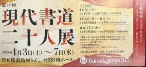 Home 新着, 未分類 第70回現代書道二十人展 第70回現代書道二十人展 2025.12.26 新着、未分類 第70回現代書道二十人展 会期:2026年1月3日(土)~7日(水) 時間: 1月3日(土) 10:00~18:30(19:00閉場) 1月4日(日)→6日(火)10:30~19:00(19:30閉場) 1月7日(水) 10:30~17:30(18:00閉場) 会場:日本橋高島屋S.C.本館8階ホール 主催:朝日新聞社