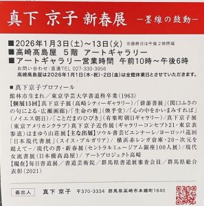 Home 新着, 未分類 真下京子新春展 真下京子新春展 2025.12.28 新着、未分類 真下京子新春展 会期:2026年1月3日(土)~13日(火) 時間:10:00~18:00(最終日は14:00閉場) 場所:高崎高島屋5階 アートギャラリー