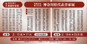 Home 新着, 未分類 第33回神奈川県代表書家展 & 第19回次代を担う新進作家展 第33回神奈川県代表書家展 & 第19回次代を担う新進作家展 2026.02.18 新着、未分類 第33回神奈川県代表書家展 & 第19回次代を担う新進作家展 会期:前期 2026年2月13日(金)~17日(火) 18日(水)は定休日 後期 2026年2月19日(木)~23日(月・祝) 会場:ゴールデンギャラリー、ギャラリー守玄齋 時間:10:00~18:00