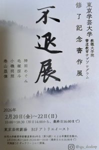 Home 新着, 未分類 不退展 & 修了記念書作展 不退展 & 修了記念書作展 2026.02.20 新着、未分類 【不退展】 会期:2026年2月20日(金)~22日(日)(初日は14:00から 最終日は16:00まで) 会場:東京芸術劇場 B1Fアトリエイースト 時間:10:00~18:30 【修了記念書作展】 会期:2026年2月20日(金) 14:00〜18:30 2026年2月21日(土) 10:00〜18:30 2026年2月22日(日) 10:00〜16:00 会場:東京芸術劇場 B1Fアトリエイースト 主催:修了記念書作展実行委員会