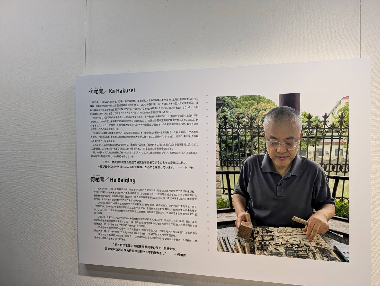 中国を代表する何柏青と日本刻字協会理事・千歳会常任理事の竹市求仙の日中刻字交流展が開催中です。