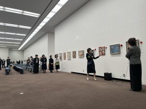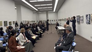 23日には千歳会の飯田桂子研修部部長の司会でギャラリートークが開催され、千歳会からは特別選考委員長賞の橋本紅邨、 日本刻字大賞の森智子、桂華賞の毛綱亨子がインタビューを受けました。