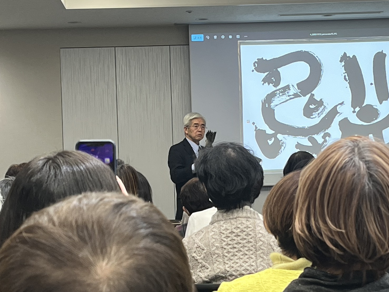 トークショーは昨年度毎日書道展実行委員長を務めた下谷洋子先生と、昨年度毎日書道展で文部科学大臣を受賞した山中翠谷先生に司会の広瀬舟雲先生が質問する形式で進められました。